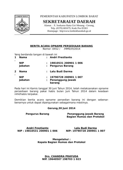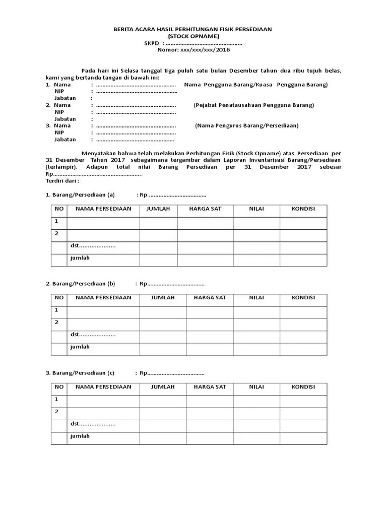 Menyatakan bahwa telah melakukan stock opname barang persediaan semester ……. Berita acara stock opname persediaan. Jadi bisa kita simpulkan bahwa berita acara stock opname adalah dokumen atau surat yang menyatakan bahwa perhitungan persediaan barang (stock opname) telah . Berita acara stock opname obat. Stock opname adalah kegiatan penghitunagn persediaan barang dagang yang tersedia secara fisik dengan nilai buku persediaan yang di laporkan.